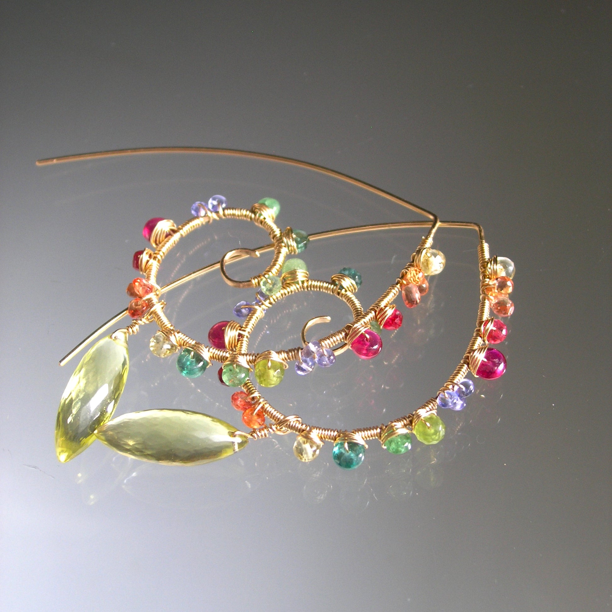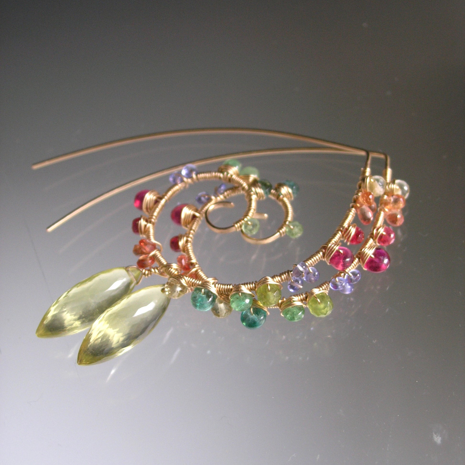 Multi Gemstone 14k Gold Filled Spiral Earrings: Lemon Quartz, Sapphires